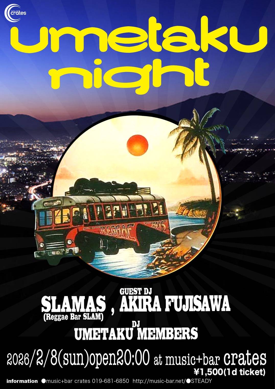 Home event, live, news 02/08(SUN)UMETAKU NIGHT 02/08(SUN)UMETAKU NIGHT event、live、news UMETAKU NIGHT :::: Schedule/Price :::: :::-// 2026.02/08(SUN) :::-// OPEN 20:00 :::-// 1500yen / 1d ticket :: GUEST DJ :: ■:: SLAMAS (Reggae Bar SLAM) ■:: AKIRA FUJISAWA :: DJ :: ■:: UMETAKU MENBERS Tweet Share Hatena Pocket RSS feedly Pin it