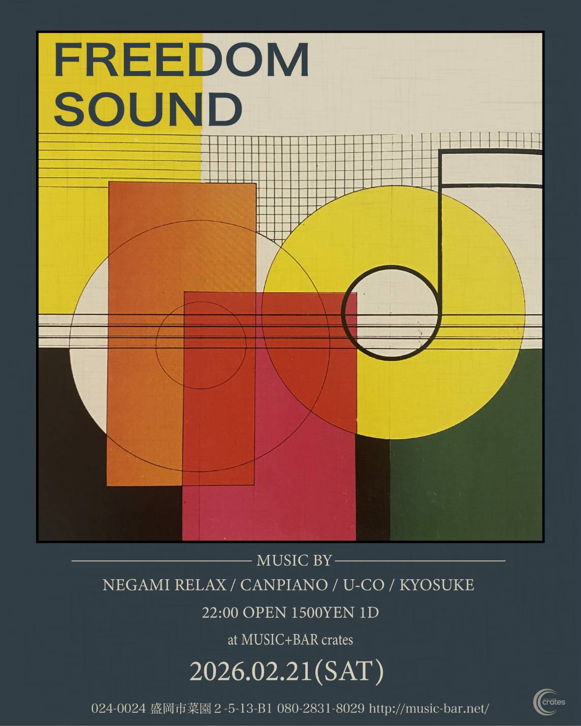 Home event, live, news 02/21(SAT)FREEDOM SOUND 02/21(SAT)FREEDOM SOUND event、live、news FREEDOM SOUND :::: Schedule/Price :::: :::-// 2026.02/21(SAT) :::-// open:22:00 :::-// ¥1,500 / 1D ::: GUEST DJ ::: ■:: NEGAMI RELAX ■:: CANPIANO ■:: U-CO ■:: KYOSUKE Tweet Share Hatena Pocket RSS feedly Pin it