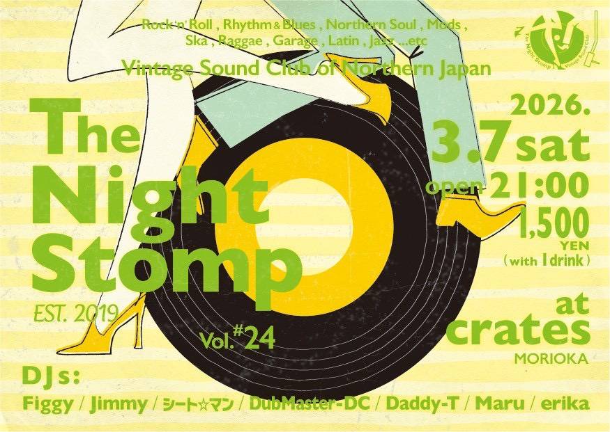 Home event, live, news 03/07(SAT)The Night Stomp Vol.24 03/07(SAT)The Night Stomp Vol.24 event、live、news The Night Stomp Vol.24 :::: Schedule/Price :::: :::-// 2026.03/07(SAT) :::-// open:21:00 :::-// ¥1,500 / 1D ::: DJ ::: ■:: Figgy (盛岡) ■:: Jimmy (青森) ■:: シート☆マン (盛岡) ■:: Dub Master-DC (釜石) ■:: Daddy-T (鹿角) ■:: maru (山田町) ■:: erika (盛岡) Tweet Share Hatena Pocket RSS feedly Pin it