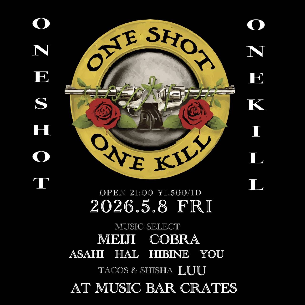 Home event, live, news 05/08(FRI)ONE SHOT ONE KILL 05/08(FRI)ONE SHOT ONE KILL event、live、news ONE SHOT ONE KILL :::: Schedule/Price :::: :::-// 2026.05/08(FRI):::-// OPEN21:00:::-// ¥1500 / 1d ticket ::: MUSIC SELECT ::: ■:: MEIJI (Guest)■:: COBRA (Guest)■:: ASAHI■:: HAL■:: HIBINE■:: HAL■:: YOU ::: TACOS & SHISHA ::: ■:: LUU Tweet Share Hatena Pocket RSS feedly Pin it